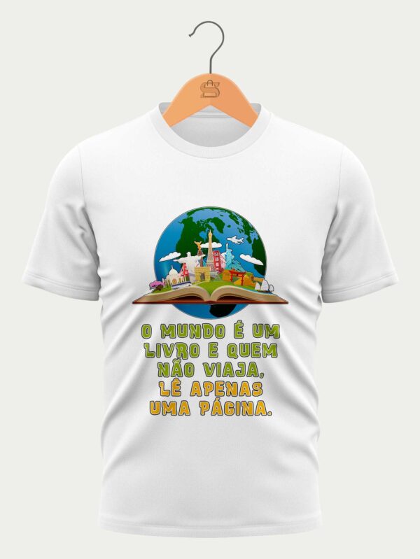 Com um design inspirador e a frase marcante “O Mundo é um Livro e quem não viaja, lê apenas uma página.” (citação adaptada de Santo Agostinho), esta camiseta é uma forma elegante de compartilhar sua filosofia de vida. Disponível em diversos tamanhos que evocam a diversidade do nosso planeta, ela é uma ótima opção para uso pessoal ou para presentear aquele amigo(a) que adora explorar o mundo.
